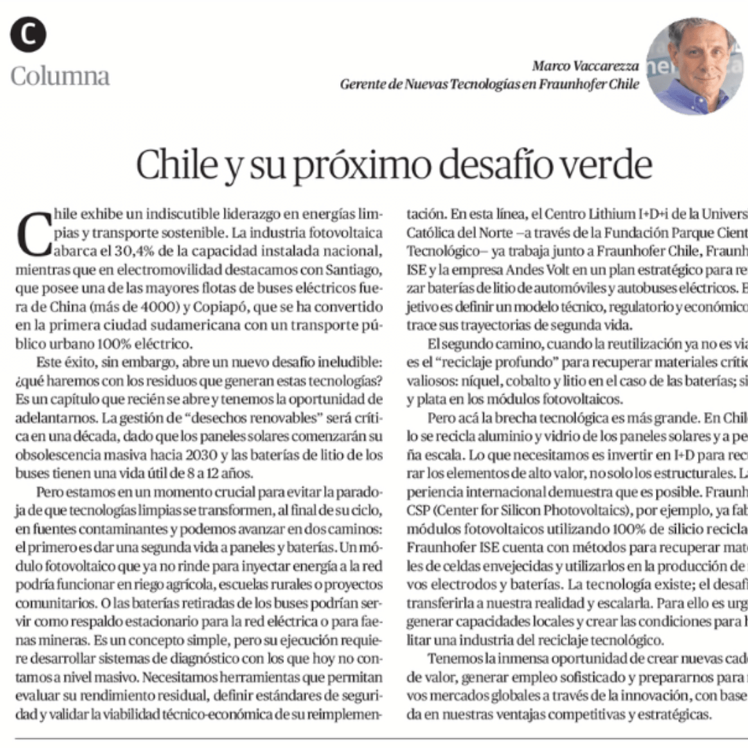 “Tenemos una inmensa oportunidad para crear nuevas cadenas de valor, desarrollar capacidades locales y generar las condiciones para el reciclaje tecnológico”, señala Marco Vaccarezza, director del Área de Nuevas Tecnologías, en su columna “Chile y su próximo desafío verde”, publicada en El Mercurio de Antofagasta.